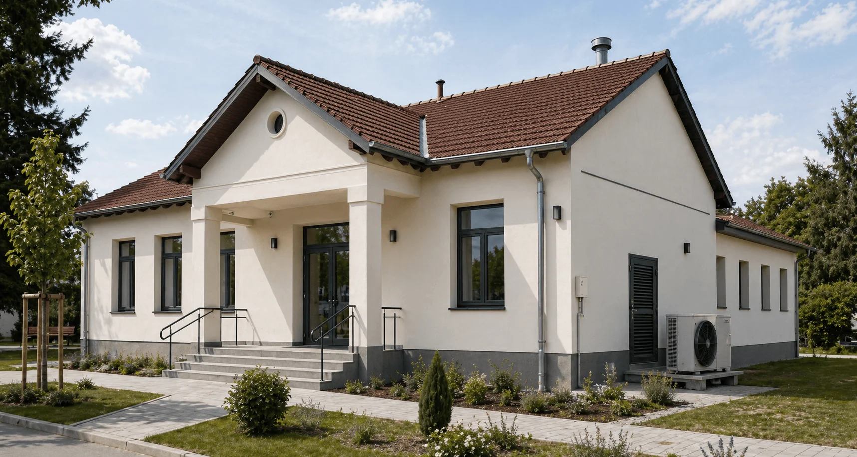 ÖnkormányzatMennyezeti fancoilos hűtés-fűtési rendszer hőszivattyúval és kondenzációs gázkazán cserével.